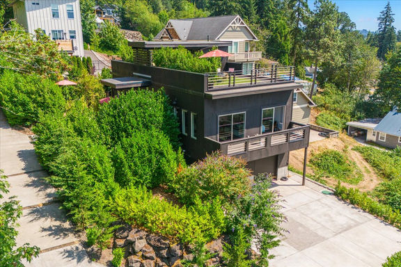 Contemporary home with functional design, ideal location, and incredible views. A private, 150-ft. tree-lined driveway leads to the row house, courtyards, and lush landscape. Hundreds of English laurels throughout the property, and with a green belt facing the house, the home is surrounded by a tranquil, oasis-like setting. The interior features an open floor plan with 12-foot ceilings and 8-foot doors throughout. The main floor has 3/4-inch hardwood floors, smooth-finish drywall, ceiling fans, recessed lighting. The kitchen is restaurant-style with gas appliances, an island, a walk-in pantry, stainless steel appliances and countertops, and an outdoor BBQ area plumbed for gas. The living room, kitchen, dining room, and primary bedroom are on the main level, each with private patios and panoramic views of the Columbia River. The Primary bathroom has subway tile, dual shower heads, pedestal sinks, and a soaking tub with a river view. The property also includes a 1,400-square-foot rooftop patio with unobstructed views, surrounded by lush English laurels, and is plumbed for an outdoor kitchen. On the lower level, two additional bedrooms have private outdoor patios, slate flooring in the hallways, and a full bath with subway tile. The oversized, insulated 2-car garage with 12-foot ceilings and smooth-finish drywall adds convenience, and the home is equipped with Cat-5 internet in every room. Located in renowned Kalama, Washington, the area features small-town charm, local events, lush surroundings, endless recreational opportunities, a waterfront lodge, pubs, restaurants, a bank/credit union, and ongoing improvements on the waterfront. This river town is 38 miles to Portland Airport and 140 miles to Seattle, offering both rural and urban living just outside this amazing live/work space.